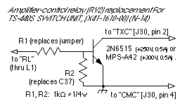 Unplug the three connectors, remove the two sheet metal screws, and lift out the Switch Unit. Unsolder and remove RY2, D16, and the white jumper-wire and the pin that it plugs into. Install one 1k Ohm resistor each in place of D16 and in place of the jumper-wire and its pin. The transistor will solder in place of the relay if its full length leads are bent to fit the available holes. The emitter goes to common-ground, as does the trace to J30, pin4 [CMC], the ground return for the relay control circuit. The base lead connects to the trace that goes to R2 {D16} and C37. The collector solders to the trace that connects to J30, pin 2 [TXC].