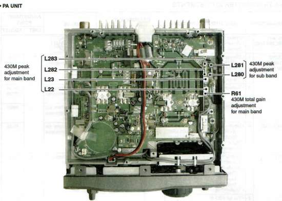 Turn off the radio and remove the top and bottom covers. If you have the UX-910 module installed, remove it in order to make the 144 and 430 band adjustments possible. It's easy, there are just 4 screws holding it in place, and 3 connectors to unplug. Set it aside until you are ready to make the 23cm adjustments.